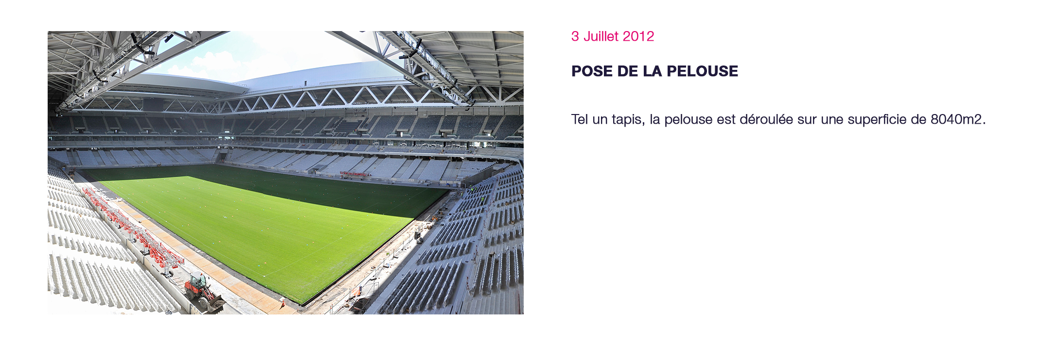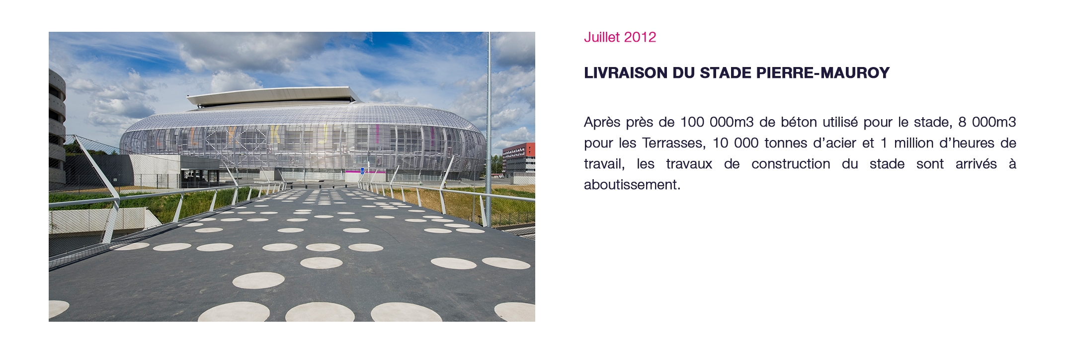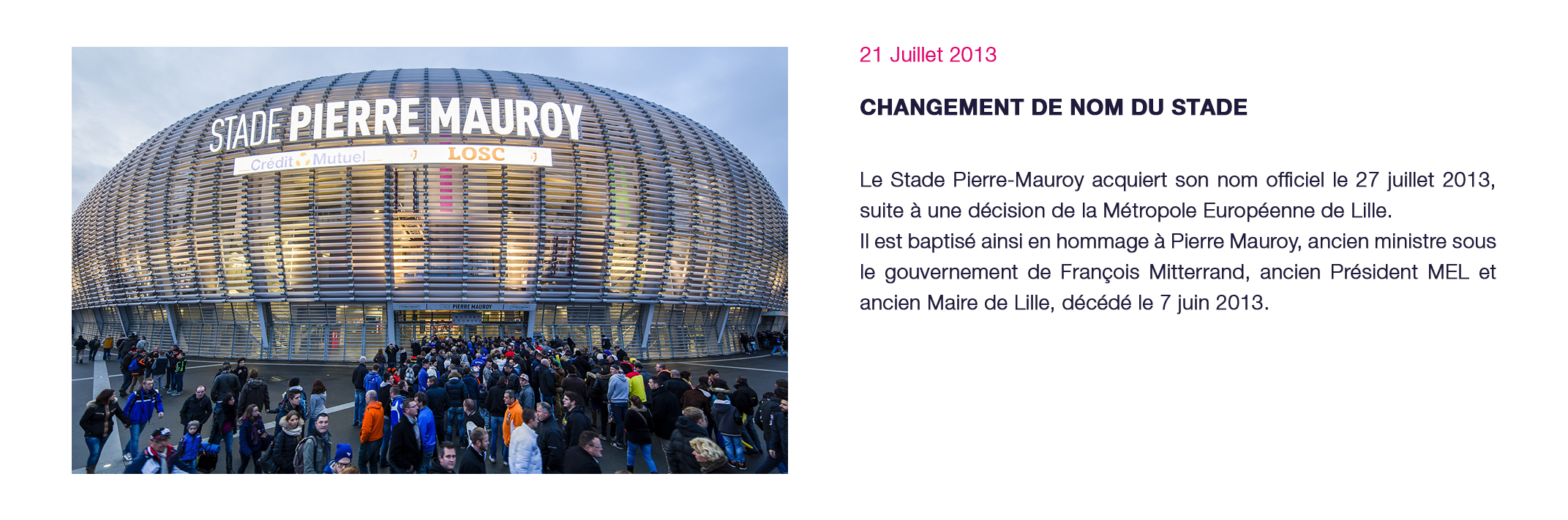 Événements majeurs : Matchs à domicile du LOSC club résident du Stade (championnat de Ligue 1 - coupe de France - coupe d’Europe), Test-match France – Argentine - novembre 2012, Demi-Finales du TOP14 - mai 2014, France-Jamaïque - dernier match de préparation à la Coupe du Monde de l’équipe de France - juin 2014