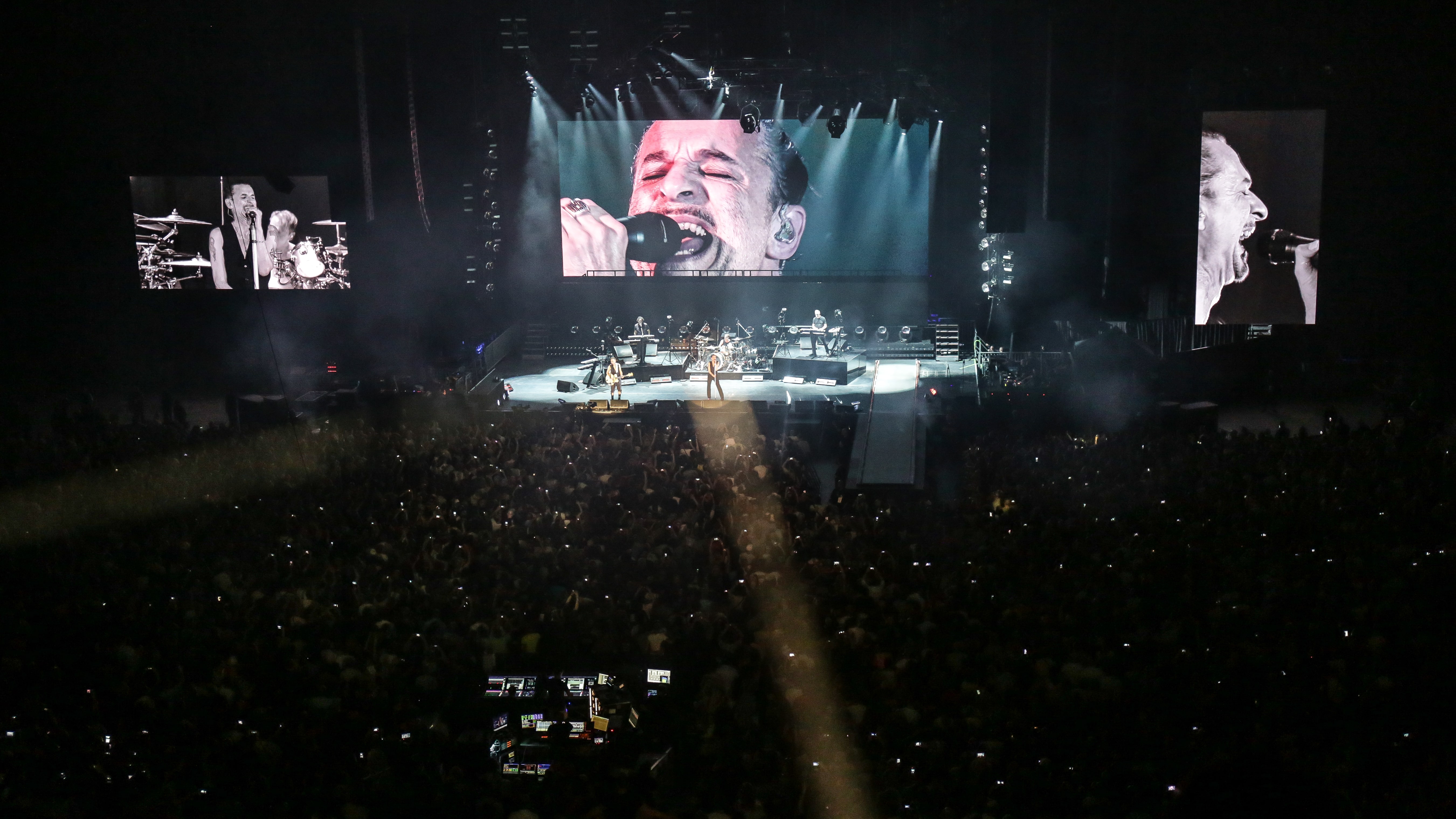 21h00 : Les lumières s’éteignent. Les notes de « Révolution » des Beatles retentissent dans l'Arena avec leurs titres rocks en hommage au groupe en référence au dernier tube « Where’s a revolution ». Tous les portables sont rivés sur la scène, attendant impatiemment l’entrée de Dave Gahan ! Le groupe arrive avec un « Good evening Lille ! » devant une salle comble et déjà survoltée. Martin Gore, Dave Gahan et Andy Fletcher enchainent ensuite leurs grands titres alternant répertoire récent (Going Backwards, So much love, Poison…) et incontournables (Enjoy the silence, Never let me down again, Stripped …) Le public, a ainsi pu retrouver le groupe qui les fait danser depuis les années 80 !
